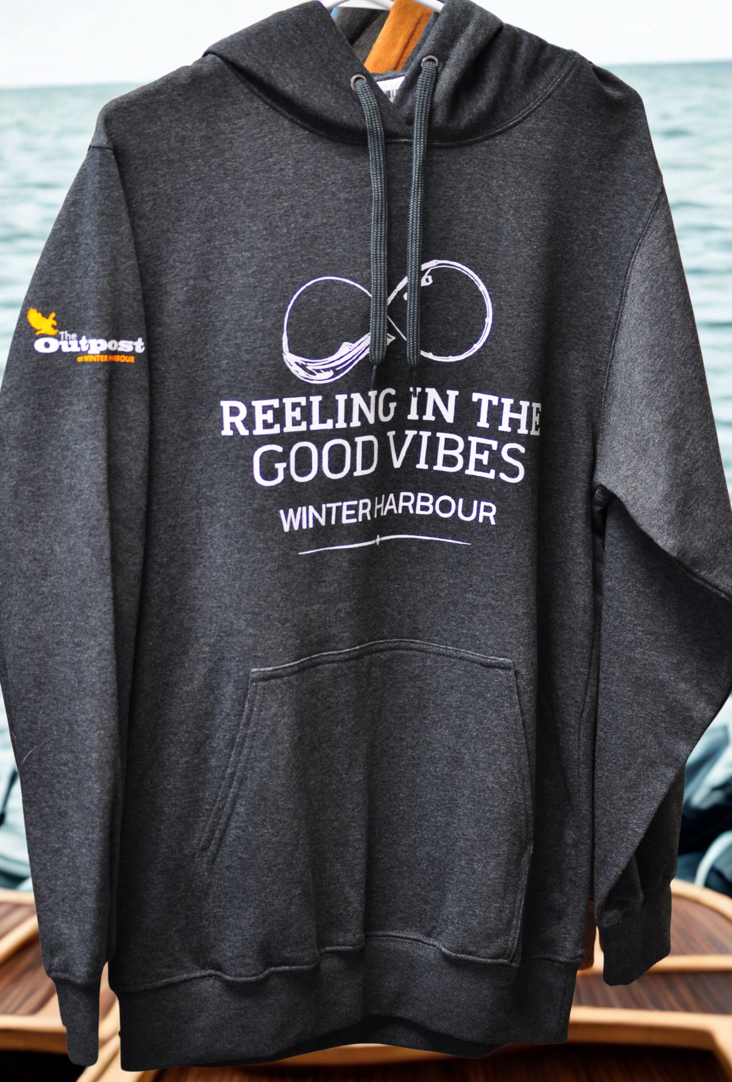 The black speckle and military green hoodies also have an Outpost Logo on the right arm.